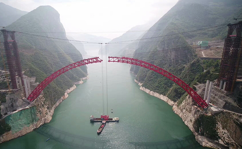 秭歸長江大橋?yàn)橹谐惺戒撓滂旒芄皹颍骺?31.2米,全長883.2米,采用2×200噸纜索起重機(jī)安裝,2018年5月22日主拱合龍。