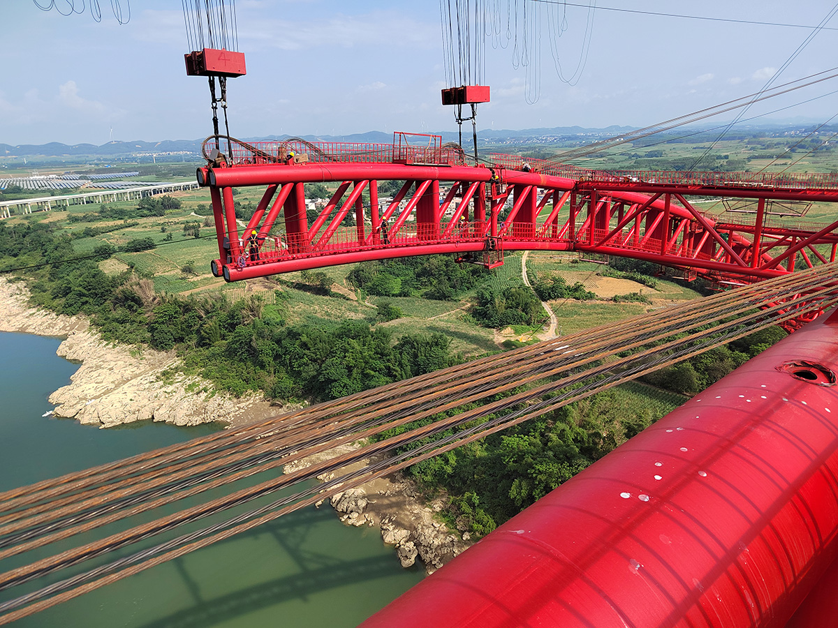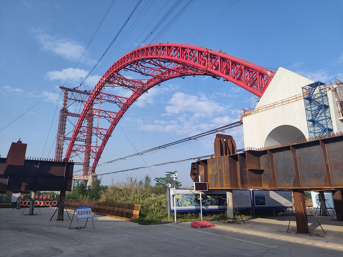 該橋?yàn)橹骺?85米的下承式系桿拱橋,全長(zhǎng)1732米,采用2×55t纜索起重機(jī)進(jìn)行安裝,2025年6月16日合龍。