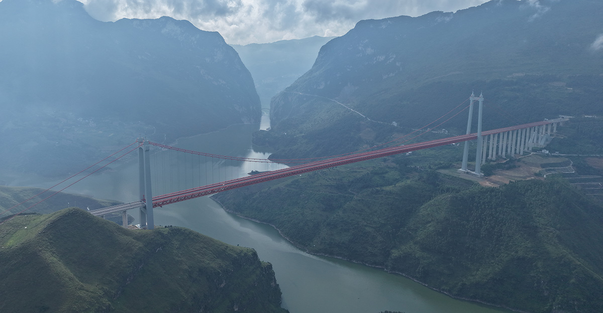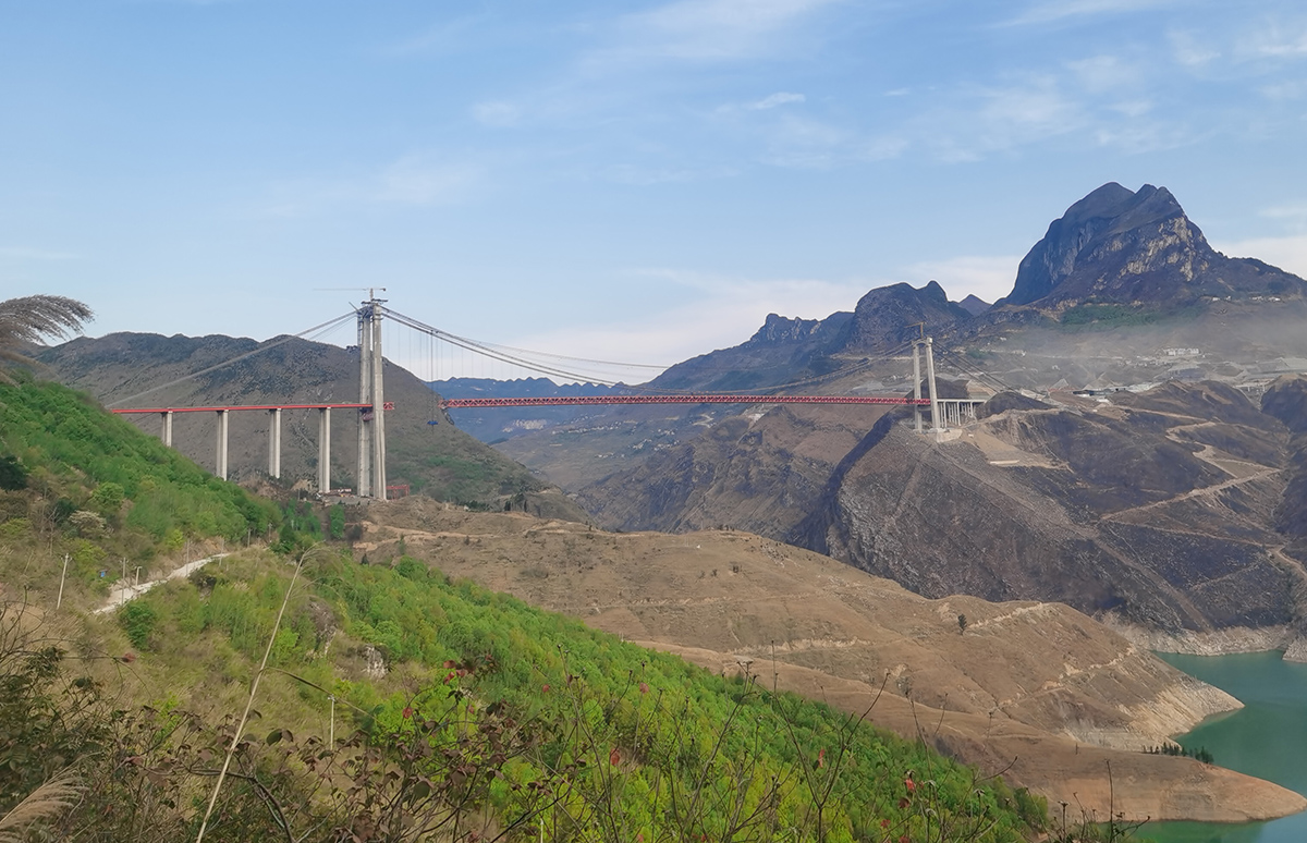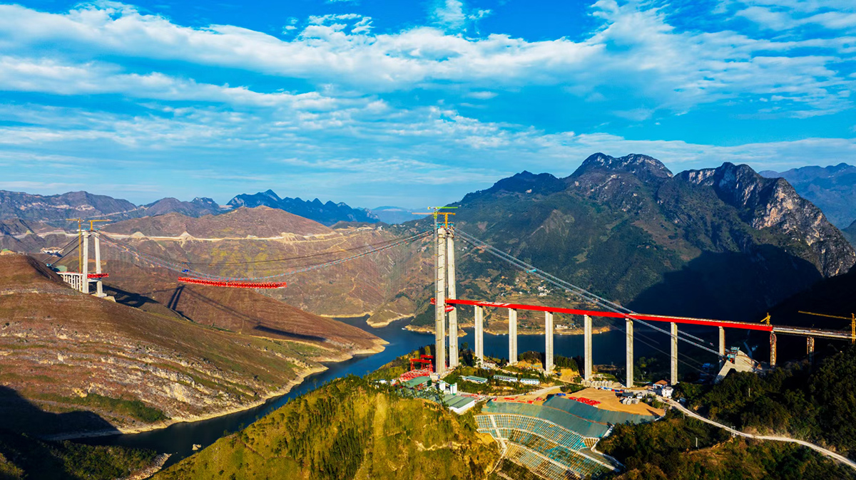 該橋為主跨1080米的雙塔單跨鋼桁梁懸索橋,全長1849米采用2×150t纜索起重機(jī)進(jìn)行安裝,2024年4月28日合龍。
